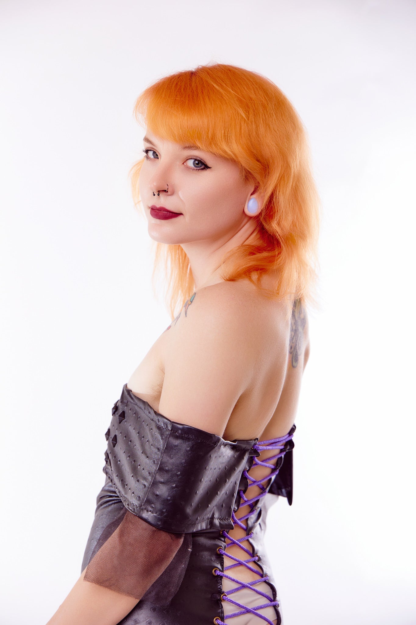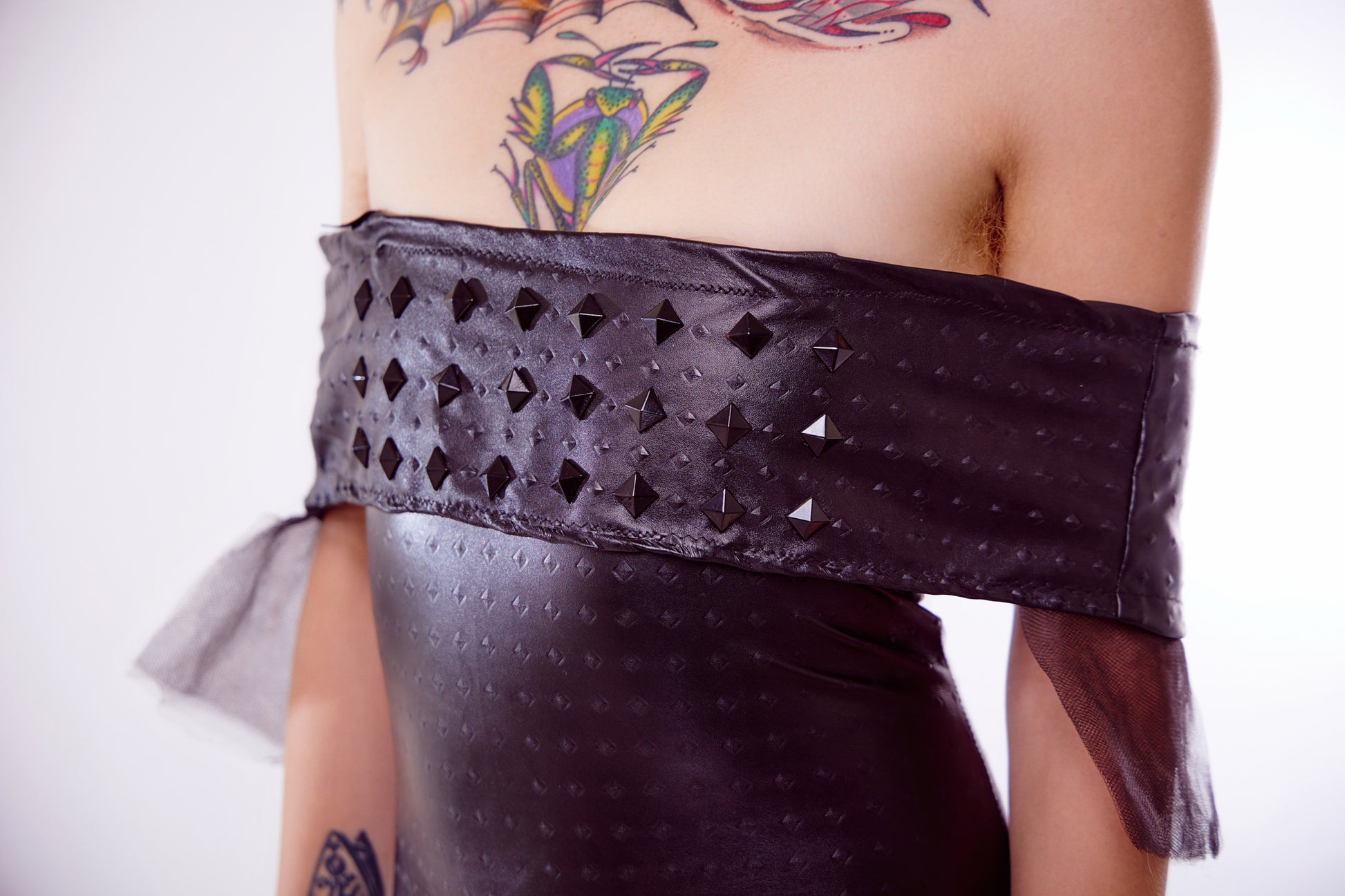 Expertly designed for the ultimate fashion statement, DominaDrex offers a unique combination of stretchy faux leather, off the shoulder sleeves, tulle accents, black studs, and an open back corset back. Indulge in the comfort and confidence provided by this one-of-a-kind piece.