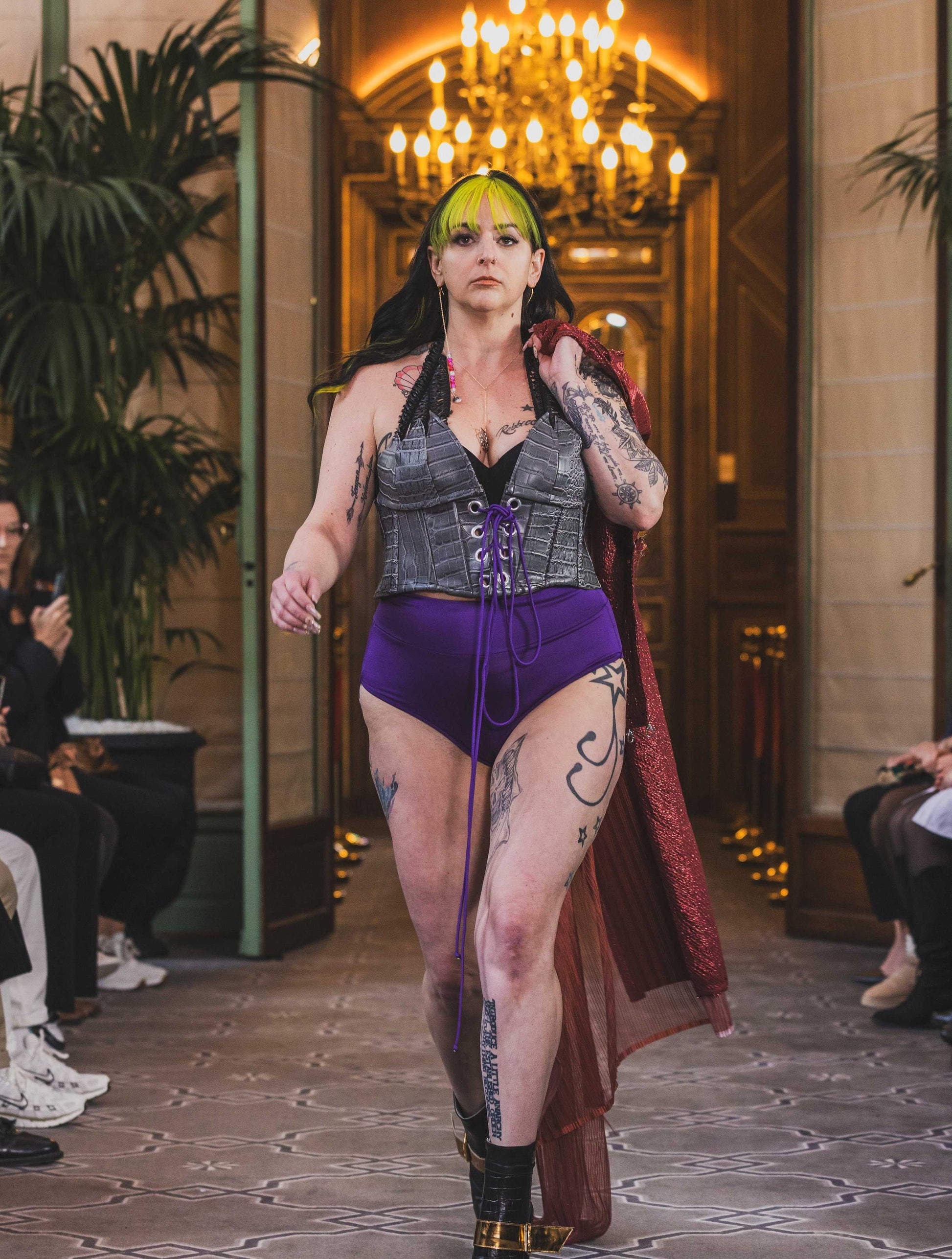 Expertly crafted with high quality gray faux alligator skin, this corset offers a unique and luxurious texture. The soft fleece lining provides comfort while the adjustable grommets on the front and back allow for a perfect fit. Topped off with elegant Black Italian lace, this corset is a statement piece for any wardrobe.