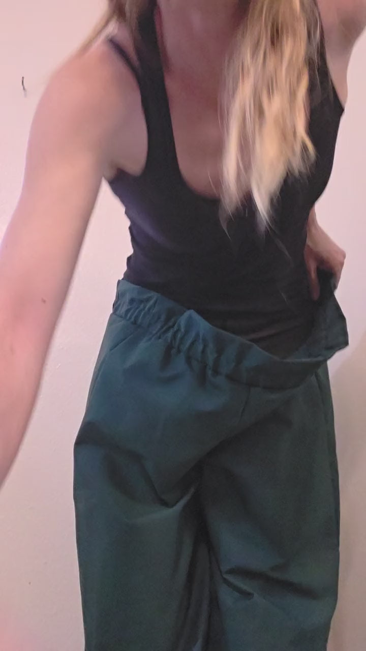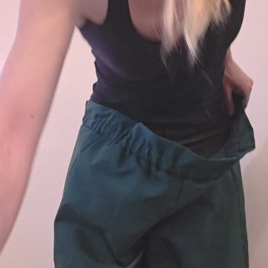 These pants are made from a soft and breathable linen fabric of a dark green color. These pants are minimalist in design with an adjustable waistband that fits all sizes 0-20 and every size in between.