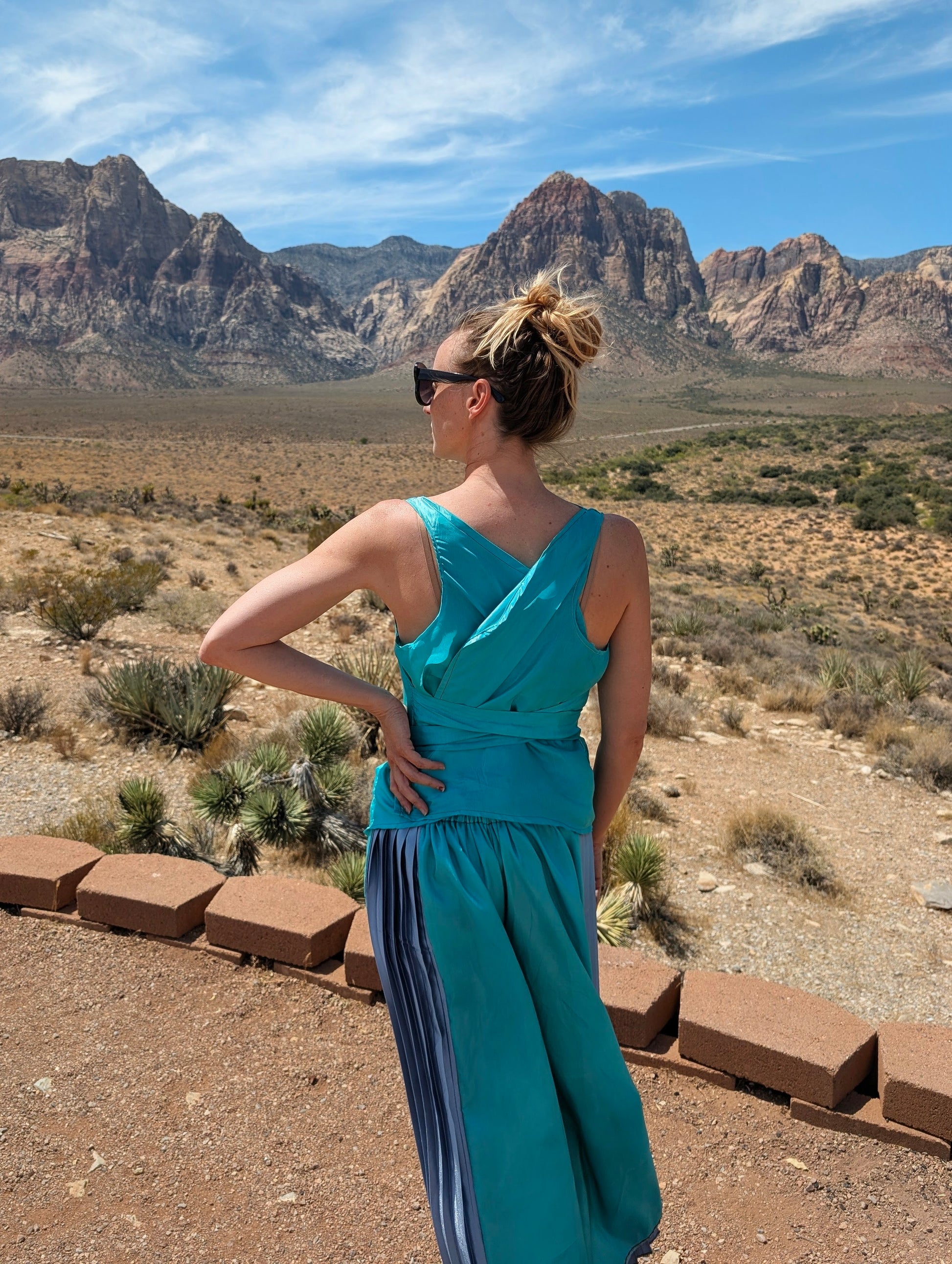 ThisbTurquoise Two piece is comprised of a top and pants that create one outfit with separates that can be worn and paired with others. The top is an open back with a wrap around waist tie. The pants, with pleated sides, include an elastic, size adjustable waist band that can be adjusted to fit any size between a standard size 0-24 and everything in between. This outfit will grow with you no matter what.
